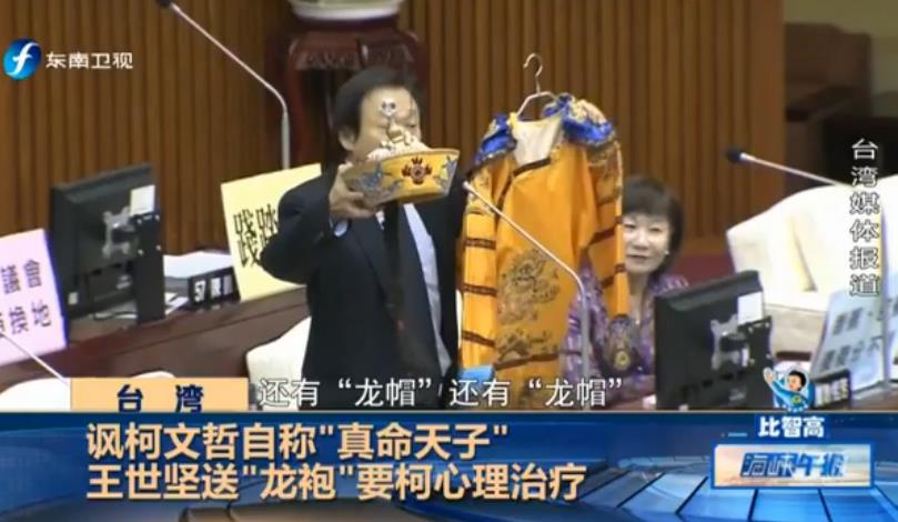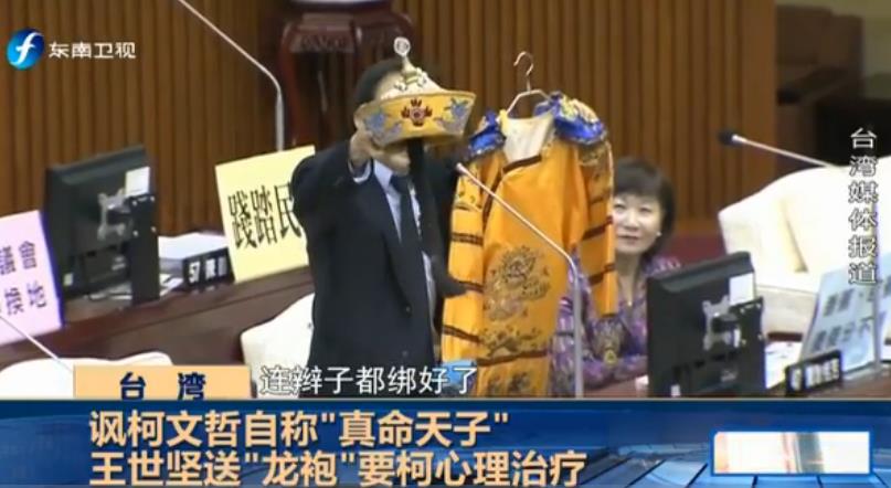 王世堅與柯文哲互懟早不止一兩次,情緒激動的王世堅也是不斷鬧出笑話。據(jù)東南衛(wèi)視報道,柯文哲10日赴議會施政報告,王世堅拿出“龍袍”“龍帽”,說要送給自稱“真命天子”的柯文哲,引起全場哄堂大笑。王世堅說:“幫柯市長準(zhǔn)備了一套‘龍袍’,讓柯市長私下在辦公室或在家里可以穿上它過過癮,這也算是一種心理治療”。他還勸說柯文哲,“送給自稱‘真命天子’的你,你就別客氣了,收下吧!