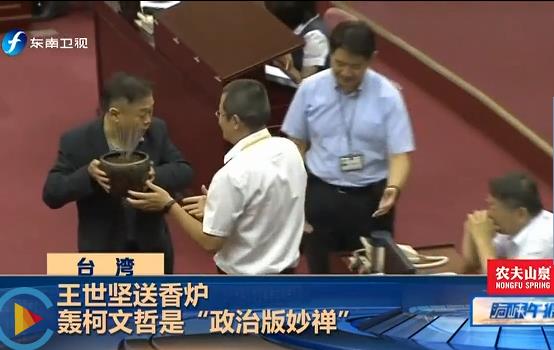 除了送龍袍、送書,王世堅還送香爐給柯文哲,并“贈與”柯文哲“政治版妙嬋”的新封號。王世堅稱柯文哲把自己神格化、把自己供在神壇,“真是政治版的妙嬋”。面對王世堅送香爐,柯文哲則趕緊叫人把它拿走。