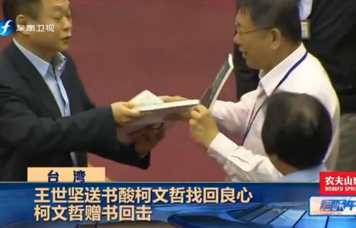 王世堅與柯文哲互相贈書。(圖片截取自東南衛(wèi)視視頻)