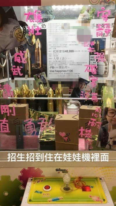 娃娃機(jī)里就有招募信息,還有負(fù)責(zé)女士官的軍裝照與臉譜網(wǎng)、line聯(lián)絡(luò)方式。(圖片取自臺(tái)媒)