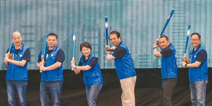 國民黨“六都”市長參選人韓國瑜(左起)、高思博、盧秀燕、陳學(xué)圣、侯友宜、丁守中化身選手,做出揮棒動作,期許打出漂亮的勝選全壘打。(圖片來源:臺灣《聯(lián)合報》)
