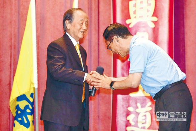 國民黨臺北市長參選人丁守中(右),26日應(yīng)邀出席新黨25周年黨慶慶祝大會,他與新黨主席郁慕明(左)互動(dòng)頻繁,并請新黨支持他競選臺北市長,致辭時(shí)提醒大家,他的對手、現(xiàn)任市長柯文哲是“墨綠”的身份。(圖片來源:臺灣“中時(shí)電子報(bào)”)
