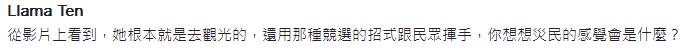國民黨發(fā)言人洪孟楷在Facebook痛批這是“史上最傲慢勘災(zāi)”,形容蔡英文像是“花車游行上的選美小姐”。還有民眾火大開嗆,“勘災(zāi)?連下來泡在水里做做秀都不肯,搭云豹來就算了,裝一下沉痛、裝一下反省可以不可以?面帶微笑是哪招?還給我揮手!你是來謝票還是來掃街?你確定你沒有跑錯棚?”