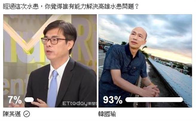 面對兩位候選人所提出的治水政策,F(xiàn)acebook社團“歷史的鏡像”發(fā)起了一項投票,主題為“經(jīng)過這次水患,你覺得誰有能力解決高雄水患問題?”沒想到韓國瑜竟拿下高達93%的超高支持率。此次水患似乎也淹掉了高雄人對民進黨的支持。(中國臺灣網(wǎng) 李寧)