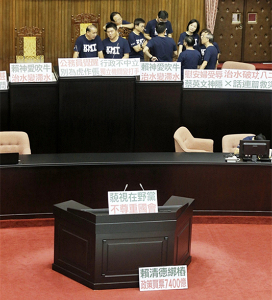 國民黨“立委”在現(xiàn)場擺滿抗議標(biāo)語,包含“公務(wù)員覺醒、別為虎作倀”“慰安婦受辱、蔡英文神隱”“賴神愛吹牛、治水變滯水”“行政不中立、獨立機關(guān)變打手”“賴清德綁樁、政策買票7400億”“假新聞?wù)妾毑、箝制新聞自由”;還在地面鋪上“東廠亂政、民主之恥”“促轉(zhuǎn)惡轉(zhuǎn)、賴揆道歉”大字。隨后一行人邊開會邊占領(lǐng)主席臺。