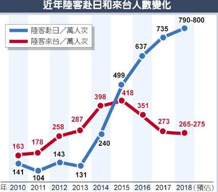 兩岸關系急轉直下,赴臺大陸游客漸減,赴日陸客大增。2017年大陸游客赴日比赴臺多462萬人次,估計今年訪日大陸游客可望上沖到790至800萬人次,幾乎是赴臺的3倍。