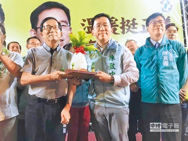 陳水扁決定10月28日為陳致中站臺(tái),“已有被抓回去的最壞打算”。圖為去年扁公開(kāi)替兒子陳致中(中)助選,送上好彩頭祝福。(圖片來(lái)源:臺(tái)灣“中時(shí)電子報(bào)”)
