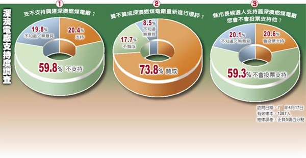 有意思的是,在被問到年底選舉將至,如果縣市長候選人支持深澳電廠,會(huì)不會(huì)投票給他?近59.3%的人表態(tài)不支持,其中有77.4%的泛藍(lán)選民表示不會(huì)投給支持深澳的候選人,泛綠選民也高達(dá)43.9%;至于沒有藍(lán)綠傾向的選民,也有53.5%不會(huì)投給支持深澳電廠的候選人。