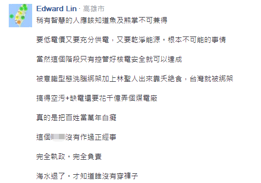 眾所周知,上月14日深澳電廠“環(huán)差案”通過后,引起島內(nèi)社會(huì)嚴(yán)重反彈,在世界各地都致力于減少燃煤發(fā)電的今天,蔡英文當(dāng)局卻向臺(tái)灣投下一枚“空污炸彈”,如此倒行逆施的做法也讓民眾心寒;而隨著天氣逐漸轉(zhuǎn)暖,缺電危機(jī)開始慢慢浮現(xiàn),要求重啟核電的聲音也變得更加明顯。這可讓“環(huán)保署長”李應(yīng)元坐不住了,一言不合直接“公投”……