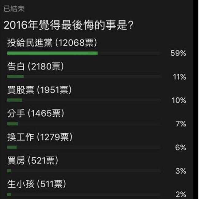 2016年底,PTT鄉(xiāng)民曾舉辦過一個(gè)“2016覺得最后悔的事是?”的投票,獲得第一名的就是得票率高達(dá)59%的“投給民進(jìn)黨”,執(zhí)政僅半年多民眾口碑便“雪崩式”下滑,對(duì)此,國民黨文傳會(huì)副主委李明賢還特意貼出截圖諷刺民進(jìn)黨“年初年尾都獲得高票,真是另類的一路走來始終如一啊”!