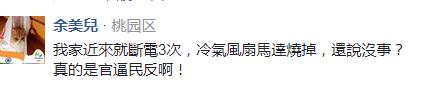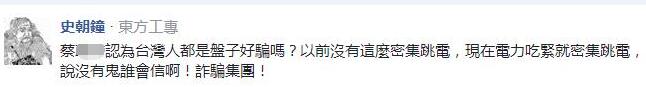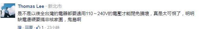 但網(wǎng)友還是不領情,“又在說干話”;有人直言,對于可能發(fā)生停/跳機原因,沒有預防性措施或任何作為,放任隱藏停/跳電危機,還好意思歸究設備老舊及天氣炎熱這類干話,信義區(qū)及臺北101是屬于臺北市較晚開發(fā)的地方,“你們相信因為設備老舊造成停電?大家都心知肚明別再騙了”;更有人說“現(xiàn)在臺灣每天都像在抽生死簽,看誰倒霉輪到誰限電……哦,臺電說這是跳電”。