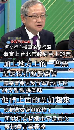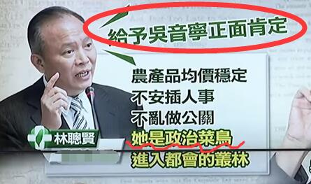 “主委”林聰賢力挺吳音寧,不僅夸贊說她上任以來農(nóng)產(chǎn)品的平均價格都很穩(wěn)定,還稱她是“進入都市叢林的政治菜鳥”;
