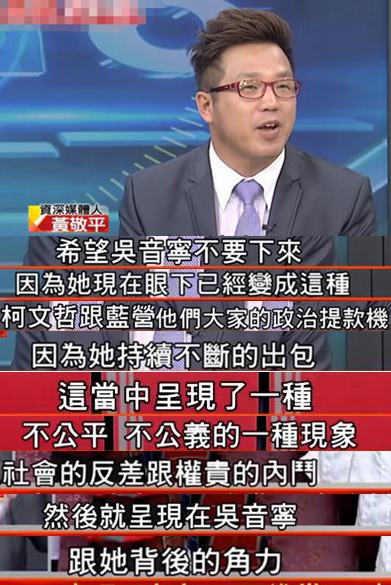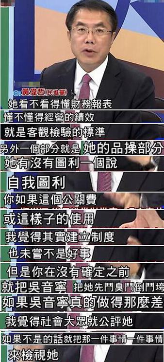 民進黨民代黃偉哲也在政論節(jié)目中舌戰(zhàn)“懟吳團”,不僅說吳音寧品操沒問題,從沒做過“自我圖利”的事兒,還指責外界明明沒有把所謂“公關(guān)費”的制度建好,卻還硬要先把吳音寧“斗臭斗倒斗垮”。