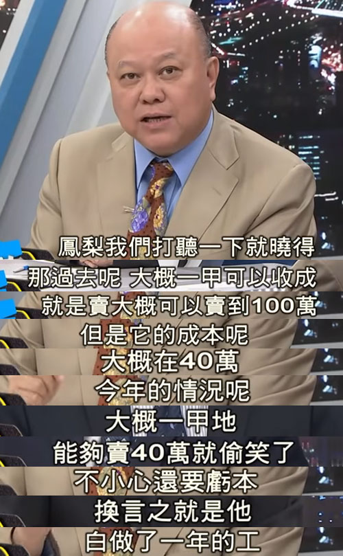 而對于林聰賢的辯駁,李勝峰則給出了一組數(shù)據(jù):過去在臺南,農(nóng)民自整地到種植鳳梨,1甲地(約14.5畝)的收成大概可以賣到100萬,而它的成本在40萬左右,盈利額約為60萬;而以今年的情況來看,1甲地的鳳梨能賣40萬就要偷笑了,一不小心還會虧本,果農(nóng)們整年的辛苦很可能變成無用功。