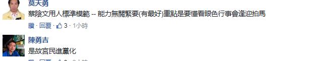不少網(wǎng)友表示“這就是蔡英文的用人模范啊”、“故宮‘民進黨化’了啊”……