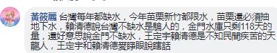 此外,王定宇的“無腦”言論還波及到了賴清德及整個(gè)民進(jìn)黨,“臺(tái)灣每年都缺水,但賴清德還說臺(tái)灣不缺水呢,騙人的,王定宇和賴清德一樣都愛睜眼說瞎話”、“這就是白癡啊”、“無能又腦殘的冥盡擋政客”!