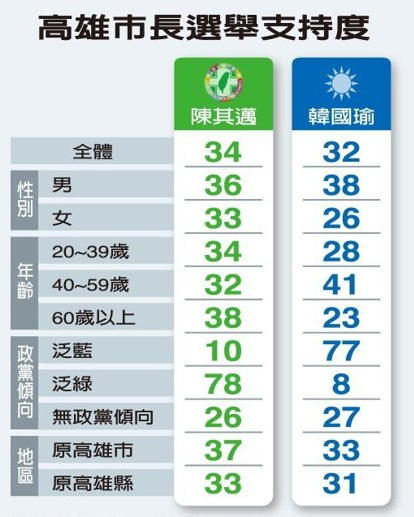 《聯(lián)合報(bào)》的最新調(diào)查發(fā)現(xiàn),高雄市選情五五波,民進(jìn)黨參選人陳其邁獲得34%選民支持,32%選民則力挺國民黨參選人韓國瑜,選戰(zhàn)陷入膠著,進(jìn)入到所謂的黃金交叉范圍內(nèi),韓國瑜未來的漲勢可能比陳其邁更強(qiáng)勁。