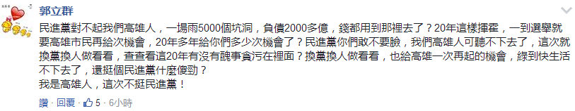 還有高雄市民加入進(jìn)來,痛批綠營在高雄執(zhí)政多年,綠到快生活不下去了!網(wǎng)友明確表示,我是高雄人,這次不挺民進(jìn)黨: