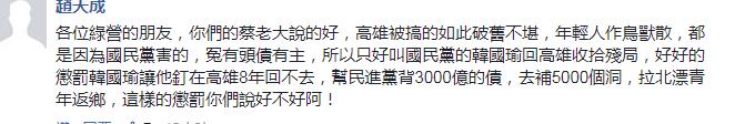 有人則“認同”地提議,既然蔡英文說高雄今天的落魄是被國民黨所害,那“冤有頭債有主,就讓國民黨的韓國瑜回高雄收拾殘局吧,這懲罰多好”;