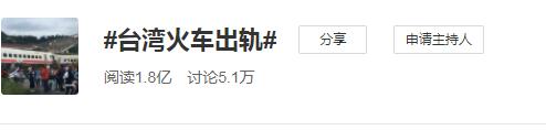 與此同時,大陸網(wǎng)友對此事件也高度關注,#臺灣火車出軌#話題更在第一時間登上熱搜,截止發(fā)稿時,該話題閱讀量已達1.8億次、被討論5.1萬次。