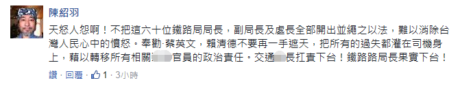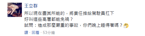 針對(duì)此次事故的調(diào)查結(jié)論,有島內(nèi)網(wǎng)友表示,“這些所謂的高管為了脫身,不惜將所有的責(zé)任都推給一個(gè)司機(jī),難道晚上能睡的安穩(wěn)嗎?”;還有人指出,“如不將這些高管繩之于法,恐怕難以平息民眾的怒火!