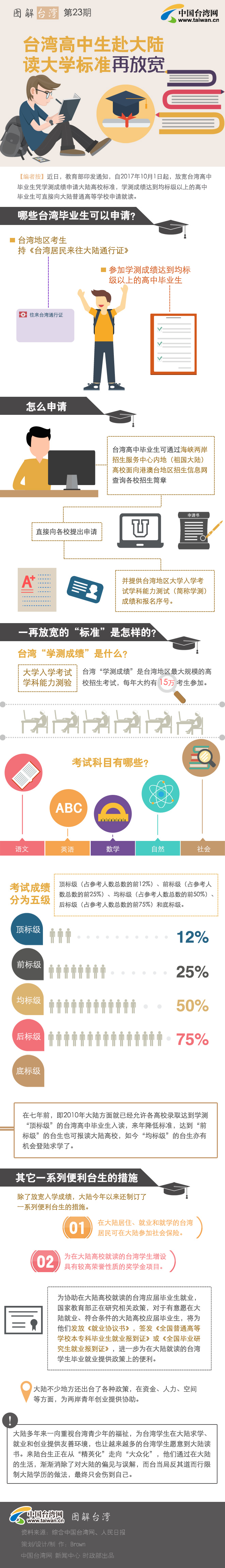 【編者按】近日,教育部印發(fā)通知,自2017年10月1日起,放寬臺灣高中畢業(yè)生憑學(xué)測成績申請大陸高校標準,學(xué)測成績達到均標級以上的高中畢業(yè)生可直接向大陸普通高等學(xué)校申請就讀。