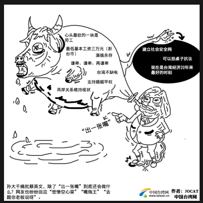 據臺灣《中時電子報》報道,臺灣地區(qū)領導人蔡英文日前在民進黨候選人造勢場合致辭時呼吁選民,絕對不能把選票投給“只出一張嘴”、讓臺灣走回頭路的政黨。國民黨前“立委”孫大千10月29日在臉譜網(facebook)發(fā)文諷刺,蔡英文口中所說的只會出一張嘴的人,不就是你自己嗎?