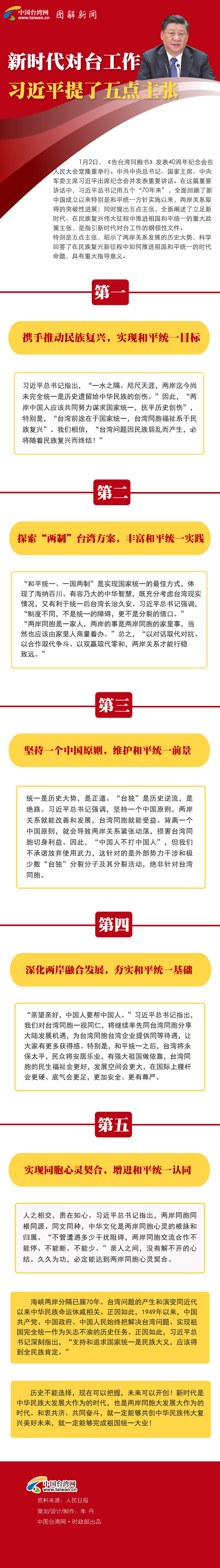 特別是五點(diǎn)主張,昭示了兩岸關(guān)系發(fā)展的歷史大勢(shì),科學(xué)回答了在民族復(fù)興新征程中如何推進(jìn)祖國(guó)和平統(tǒng)一的時(shí)代命題,具有重大指導(dǎo)意義。