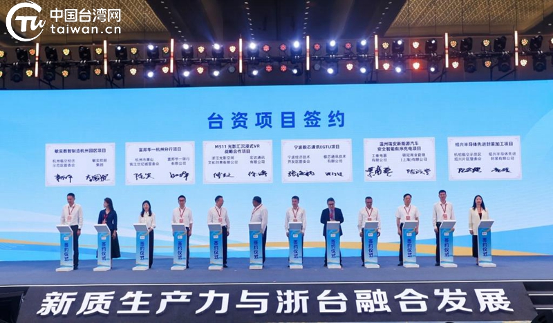 2024浙江·臺(tái)灣合作周開幕式上,現(xiàn)場(chǎng)簽約12個(gè)臺(tái)資項(xiàng)目,兩岸同胞正一步一個(gè)腳印把宏偉藍(lán)圖變成美好現(xiàn)實(shí)。(中國(guó)臺(tái)灣網(wǎng)發(fā))