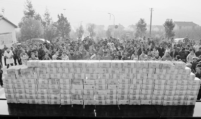 1月14日上午,四川涼山州冕寧縣復(fù)興鎮(zhèn)建設(shè)村召開2013年分紅大會(huì),分紅金額達(dá)1311.5萬元。現(xiàn)場,重達(dá)312斤的人民幣現(xiàn)金一捆捆整齊地放在臺(tái)上,340余戶入股村民排隊(duì)領(lǐng)錢,最多的一戶領(lǐng)到了30萬元,最少的也有近萬元。(1月15日《華西都市報(bào)》)