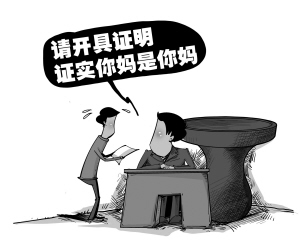 陳先生一家三口準備出境旅游,需要明確一位親人為緊急聯(lián)絡人,于是他想到了自己的母親?蓡栴}來了:他需要提供他母親是他母親的書面證明。據(jù)了解,這樣的奇葩“證明”不在少數(shù)。很多人在辦事過程中遇到過類似令人啼笑皆非的證明:要證明你爸是你爸,要證明你沒犯過罪,要證明你沒結過婚,要證明你沒有要過孩子,要證明你沒買過房……(4月8日《人民日報》)