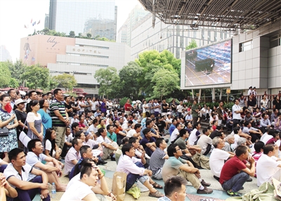 ▲ 上海南京路步行街世紀廣場上擠滿了觀看閱兵式實況轉(zhuǎn)播的人群。 本報記者 李治國攝