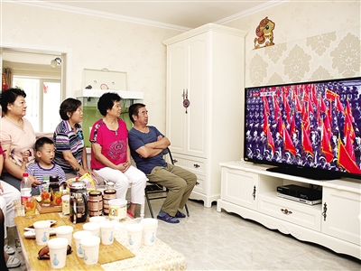 ▲ 北京西城區(qū)右安門街道群眾在家里收看直播。本報記者 高興貴攝