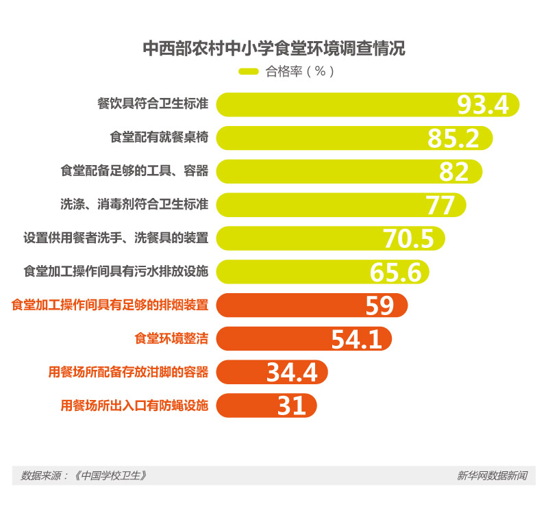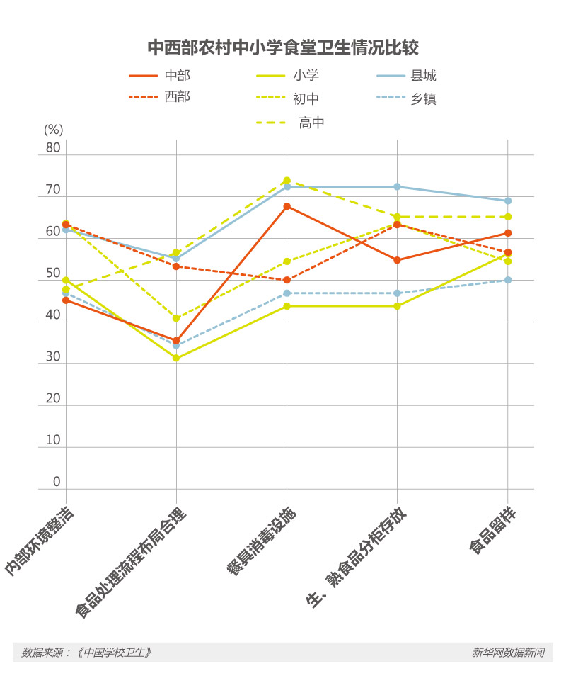 我國中西部農(nóng)村中小學(xué)食堂普遍存在衛(wèi)生與管理問題。整體來看,縣城學(xué)校的情況要明顯好于農(nóng)村,而中部城市在部分指標(biāo)卻落后于西部城市,高中學(xué)校食堂衛(wèi)生條件整體看要好于小學(xué)、初中。