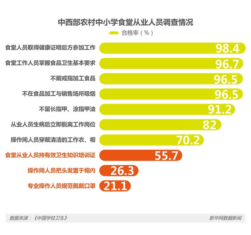 校園食堂環(huán)境衛(wèi)生是否達(dá)標(biāo),與食堂從業(yè)人員有較大的關(guān)系。根據(jù)調(diào)查顯示,中西部農(nóng)村小學(xué)食堂從業(yè)人員的衛(wèi)生健康意識(shí)還較為欠缺,存在較多不規(guī)范操作行為。