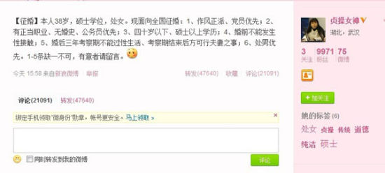 啟事說:“本人38歲,碩士學(xué)位,處女,F(xiàn)面向全國征婚:1、作風(fēng)正派、黨員優(yōu)先;2、有正當(dāng)職業(yè)、無婚史、公務(wù)員優(yōu)先;3、四十歲以下、碩士以上學(xué)歷;4、婚前不能發(fā)生性接觸;5、婚后三年考察期不能過性生活、考察期結(jié)束后方可行夫妻之事;6、處男優(yōu)先。1-5條缺一不可,有意者請留言!