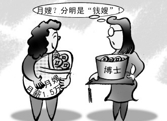 據(jù)媒體調(diào)查,北京、上海收費最貴的月嫂,月薪已超過1.5萬元,其人力成本遠高于一個經(jīng)過多年專業(yè)培訓的醫(yī)學博士。對此,有專業(yè)人士認為,“天價”月嫂現(xiàn)象主要由當代產(chǎn)婦對嬰兒護理常識匱乏,以及月嫂公司夸大月嫂服務(wù)的專業(yè)性兩種因素造成(4月10日《新京報》)!