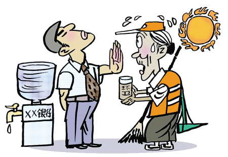 我們的城市之所以能有干凈整潔的衛(wèi)生環(huán)境,首先應(yīng)歸功于廣大環(huán)衛(wèi)工人的辛勞。而現(xiàn)在正值高溫酷暑天氣,許多環(huán)衛(wèi)工人依然堅(jiān)持在室外露天工作,全社會(huì)理當(dāng)都對(duì)他們表現(xiàn)出應(yīng)有的尊重與必要的關(guān)懷。而浙江省長(zhǎng)興縣相關(guān)銀行職員拒絕一名環(huán)衛(wèi)女工上門接水,并將其拉出銀行門外,這樣的冷漠舉動(dòng)難免遭到公眾輿論的嚴(yán)厲譴責(zé)。此后相關(guān)銀行行長(zhǎng)對(duì)銀行當(dāng)事人做出處罰,并帶隊(duì)上門向環(huán)衛(wèi)女工道歉,此舉無疑值得稱道。而此事發(fā)生后,長(zhǎng)興縣縣城主要路段100多家沿街商戶自發(fā)設(shè)置免費(fèi)供水點(diǎn),歡迎附近環(huán)衛(wèi)工人隨時(shí)前往休息和飲水,則更加令人感到欣慰。
