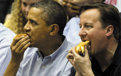 奧巴馬同卡梅倫在俄亥俄州觀看全美大學(xué)生籃球聯(lián)賽決賽,兩位領(lǐng)導(dǎo)人邊看比賽邊享用熱狗。