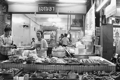 曼谷市區(qū)碧武里路7街并不寬敞的巷子里,布滿各式餐館。一家快餐店里顧客絡(luò)繹不絕,這里主營傳統(tǒng)泰餐:豬腳飯、炸魚段、炒青菜等,種類繁多,葷素均有。店主本佳告訴記者,一菜一飯需20—25泰銖(1泰銖約合0.2元人民幣),兩道菜再加5銖,只需25—30泰銖便可吃飽。本佳指著店門口懸掛的一個淺藍(lán)色牌子說,“我們就是Thong Fah”。Thong Fah在泰語里意為“藍(lán)旗”,即泰國政府推出的“藍(lán)旗”計(jì)劃,本佳的小店為顧客提供“藍(lán)旗餐”。