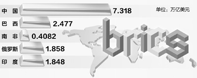 據(jù)統(tǒng)計,金磚國家總人口約占世界總人口的42%。2011年,國內(nèi)生產(chǎn)總值合計約為13.9萬億美元,占世界總量的19.86%。圖為金磚國家2011年國內(nèi)生產(chǎn)總值。 (數(shù)據(jù)來源:世界銀行 制圖:蔡華偉)