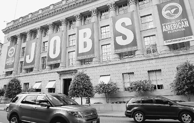 美國(guó)勞工部今年8月公布的數(shù)據(jù)顯示,7月份美國(guó)非農(nóng)部門(mén)新增就業(yè)崗位16.2萬(wàn)個(gè),失業(yè)率從前一個(gè)月的7.6%降至7.4%,是2008年12月以來(lái)的最低值。圖為懸掛“工作”字樣橫幅的美國(guó)商會(huì)大樓。新華社發(fā)
