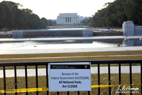 華盛頓二戰(zhàn)紀念園柵欄外掛出“因聯(lián)邦政府關(guān)閉,所有國家公園關(guān)門”的告示牌。后面的林肯紀念堂也因此關(guān)門。本報記者 溫憲攝