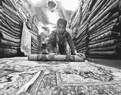 在“地毯大王”奧薩馬的店里,一名少年正在卷起鋪開的地毯。本報(bào)記者 焦翔攝