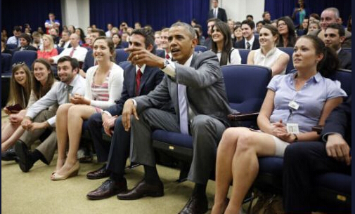 2014年7月1日,美國總統(tǒng)奧巴馬在艾森豪威爾行政辦公室與員工一起看美國和比利時之間的世界杯足球賽。