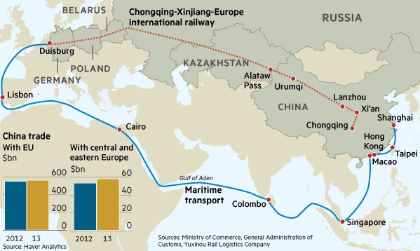 習(xí)近平提出這些雄偉構(gòu)想的一個(gè)動(dòng)機(jī)在于,他希望加強(qiáng)中國內(nèi)地、特別是西部地區(qū)與歐洲的聯(lián)系。假如這些倡議成真,那或許將相當(dāng)于自中國20年前開始成為國際貿(mào)易的重要參與者以來,全球貿(mào)易路線的一次最大洗牌。