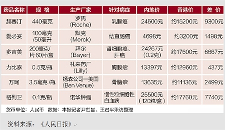 赫塞汀是靶向治療藥物的一種,用于治療部分胃癌、乳腺癌。440毫克的赫塞汀在內(nèi)地售價24500元,香港約15200元,美國約24400元,其中,內(nèi)地與香港的差價約9300元,與發(fā)達國家中藥價最高的美國的差價是100元。