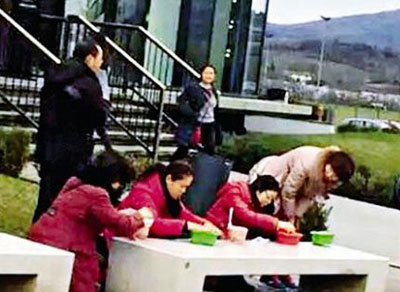 數(shù)名大媽寒天中蹲在Gucci名店前的石椅上吃泡面。(圖片來源網(wǎng)絡(luò))