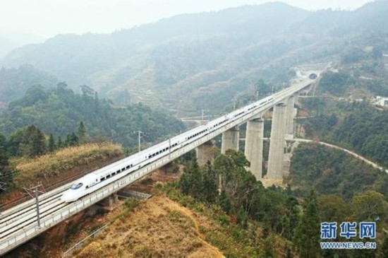 資料圖片:2014年12月26日,動(dòng)車駛過(guò)貴州省從江縣境內(nèi)的高架橋。當(dāng)日,貴廣高鐵、南廣高鐵正式開通運(yùn)營(yíng)。 新華社記者 劉續(xù) 攝