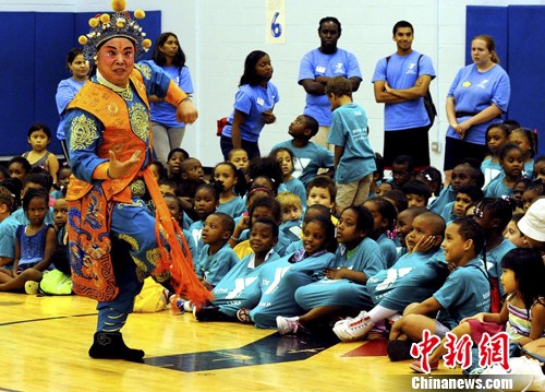 資料圖片:紐約梨園社演員到紐約布碌侖學(xué)生夏令營(yíng)演出京劇《扈家莊》選段,各族裔小觀眾欣賞演員的精彩演出。